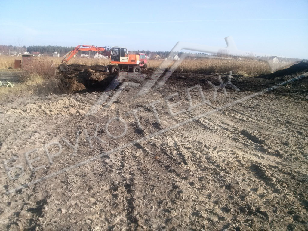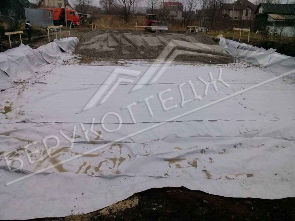 Устройство фундаментной монолитной ребристой плиты с частичным замещением грунта (торфяник), устройством дренажа и стабилизацией грунтов геотекстилем.