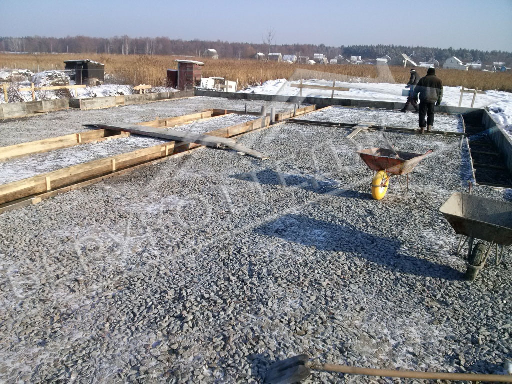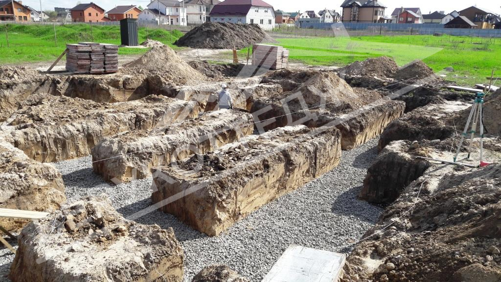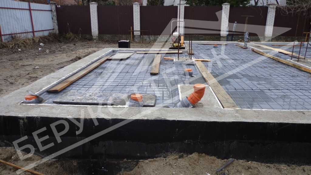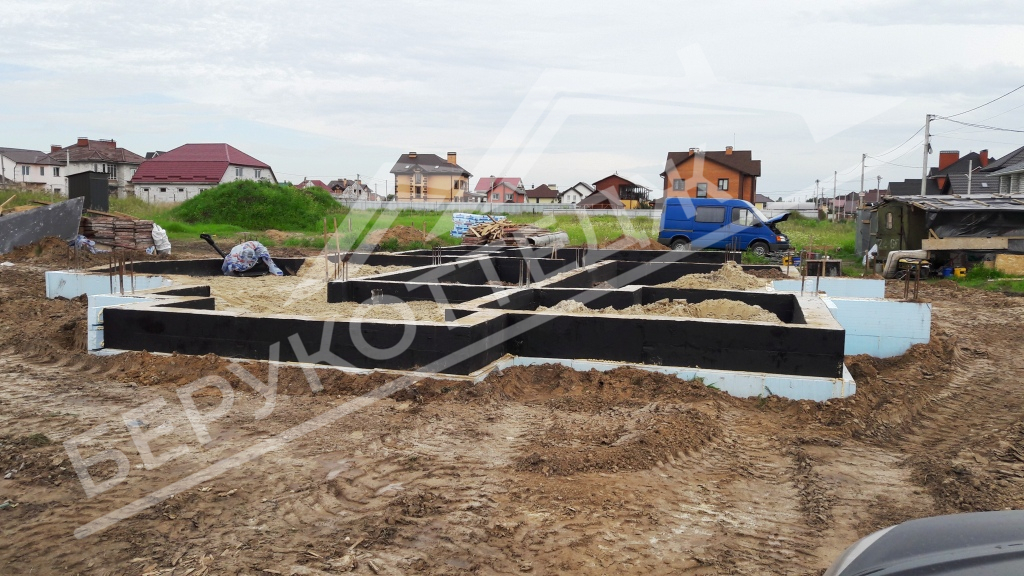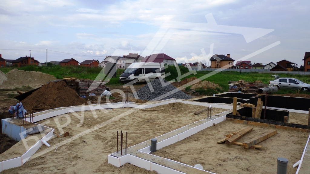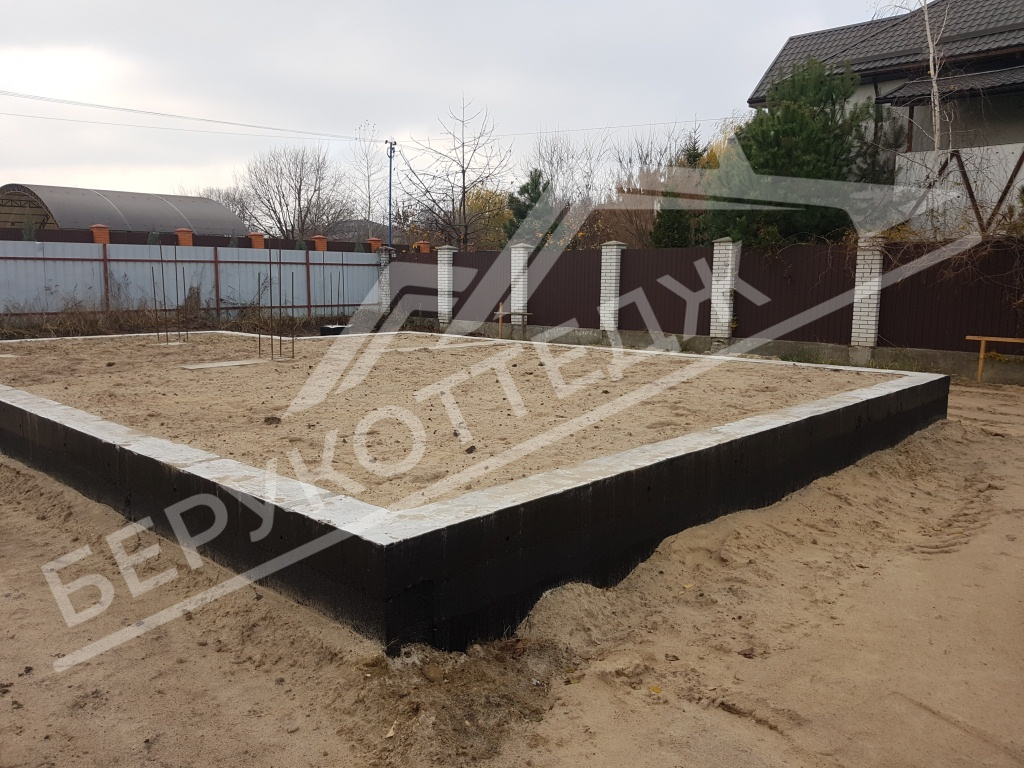 Фундамент: монолитно ленточный с монолитной плитой , обмазочная гидроизоляция, утепление по периметру 50 мм экструдированням пенополистеролом ниже точки промерзания та разводка коммуникаций под плитой.