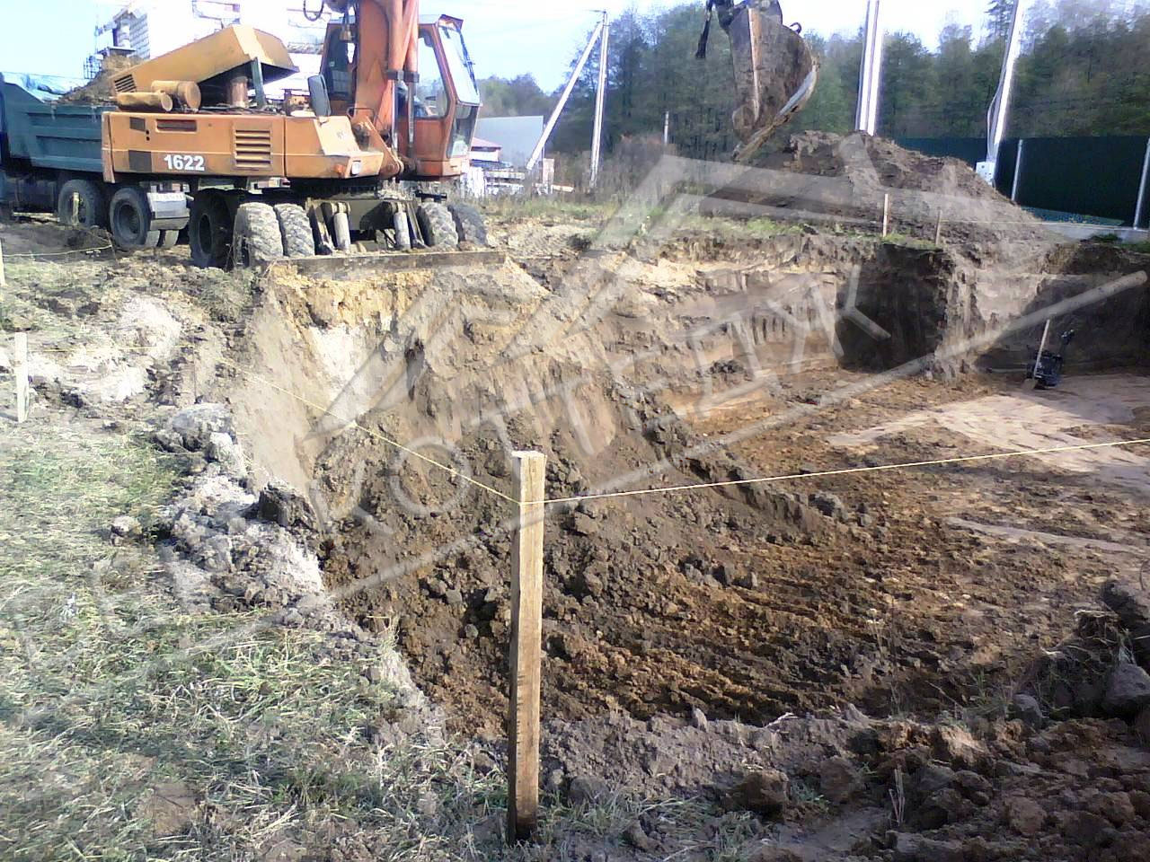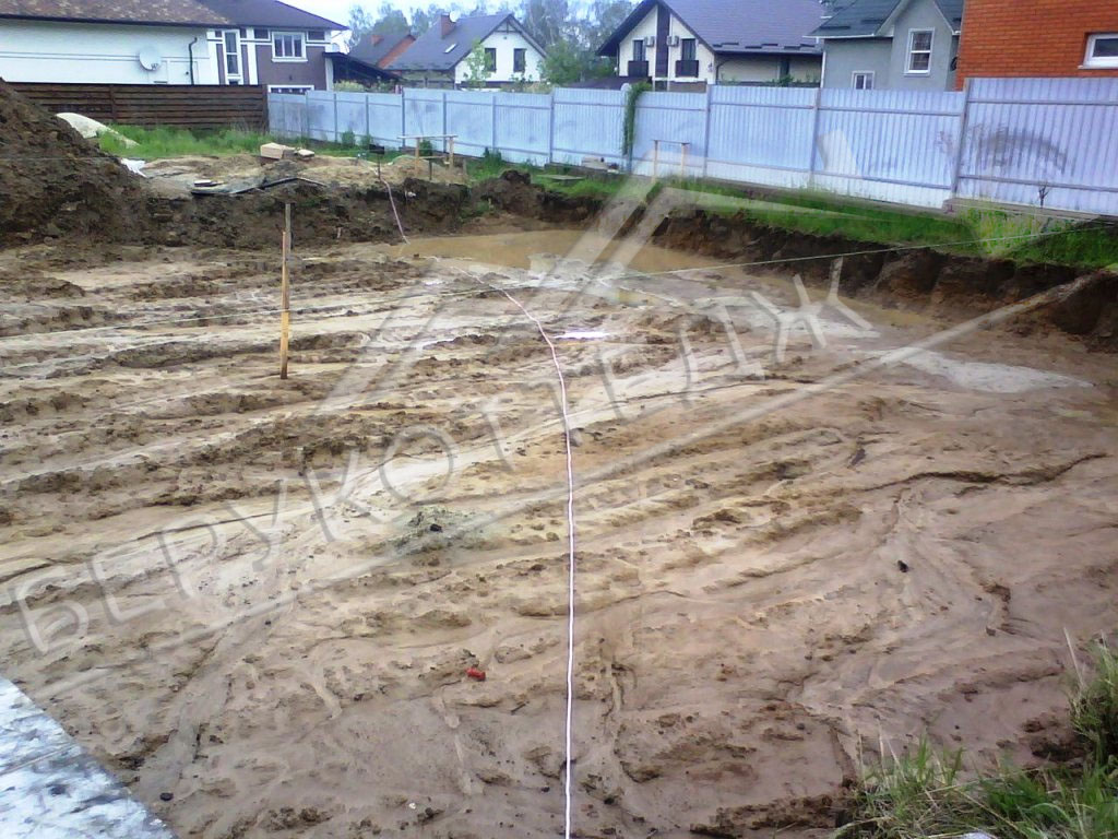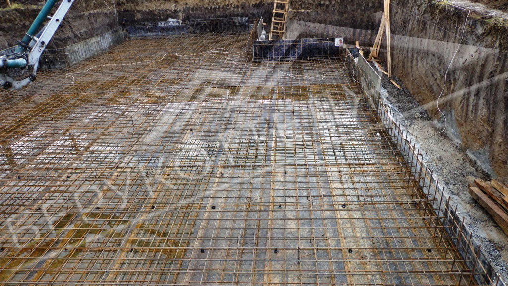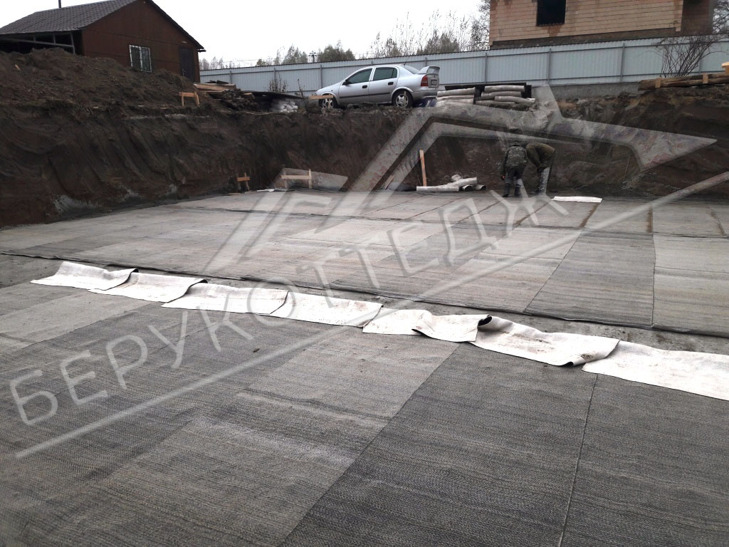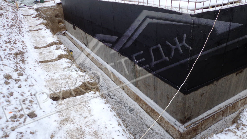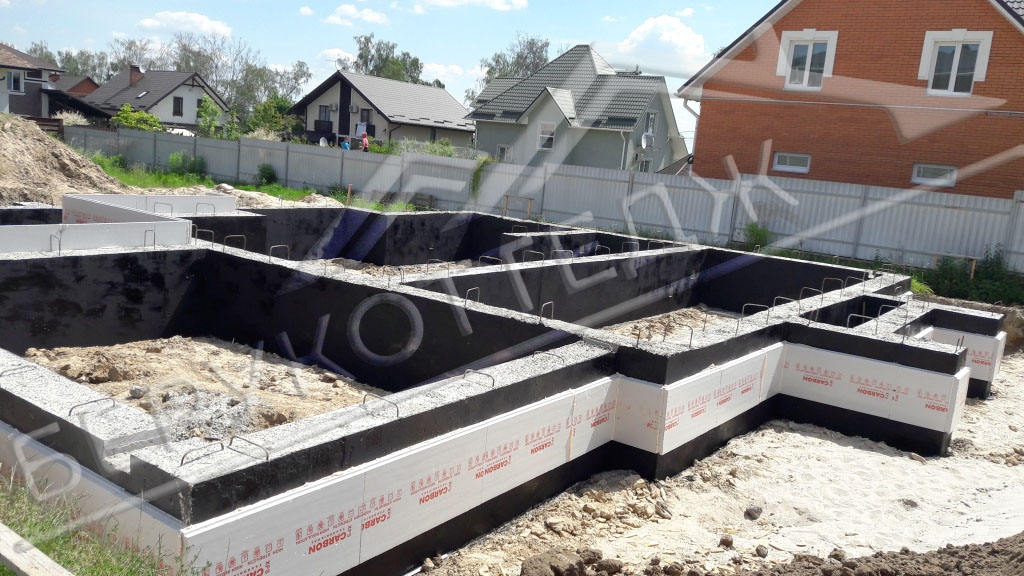 Фундамент монолитный : армированная монолитная плита, стены монолитные и монолитное перекрытие. Выполнено устройство обмазочной гидроизоляции в два слоя выше уровня грунтовых вод. Под плитой и стенам подвала уложены бентонитовые маты ниже отметки грунтовых вод, произведено утепление стен подвала пеностеклом 100 мм. ниже точки промерзания.
