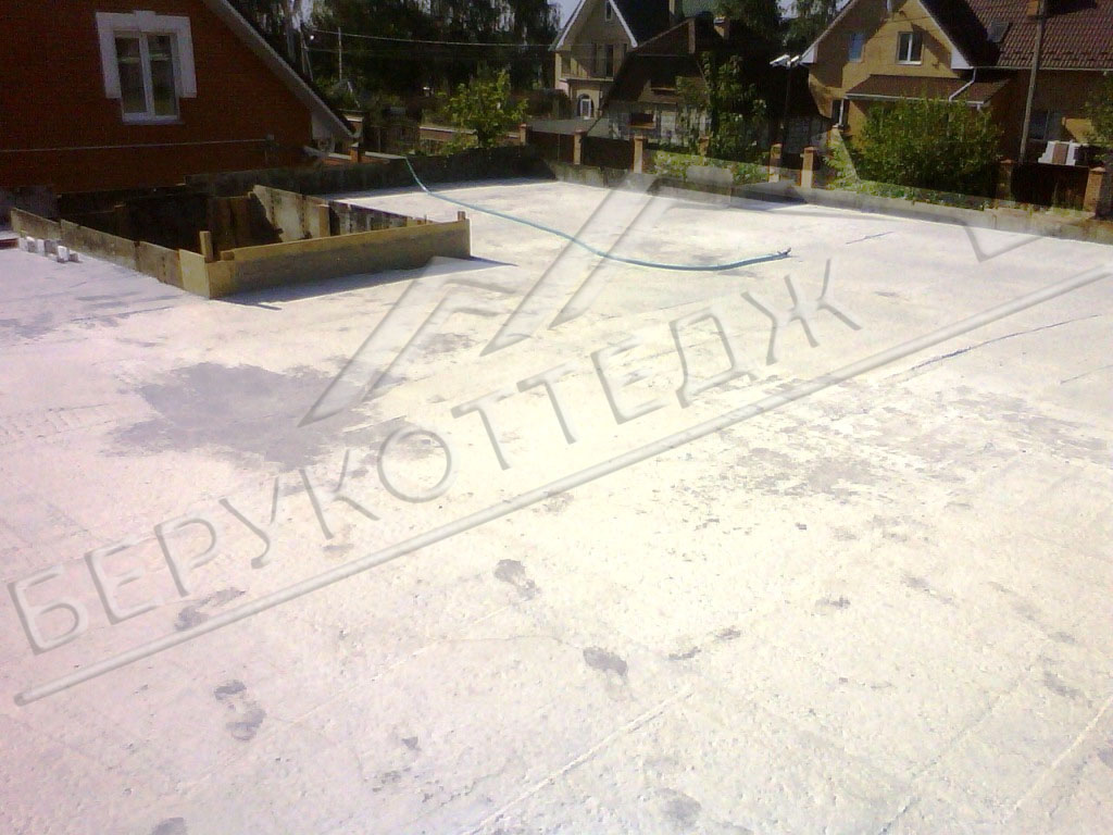 - Перекрытие и плоская кровля: монолитная плита 200 мм в трех уровнях. Утепленная ватой плотностью 200 кг/м2, поверх уложена ПВХ мембрана.