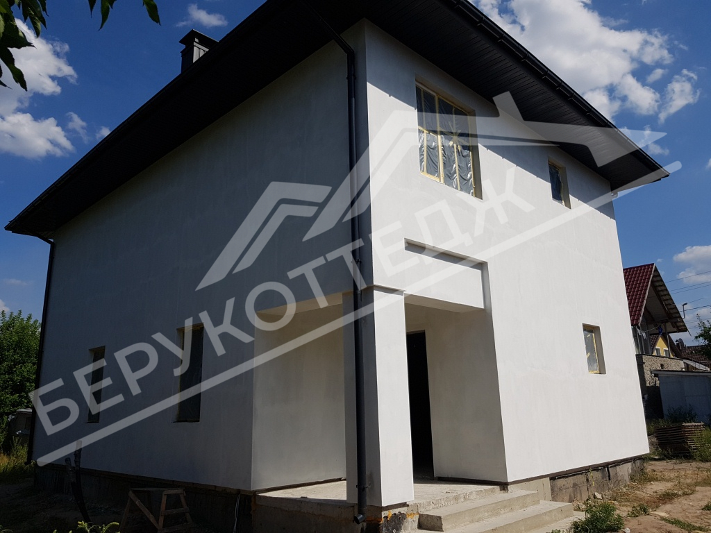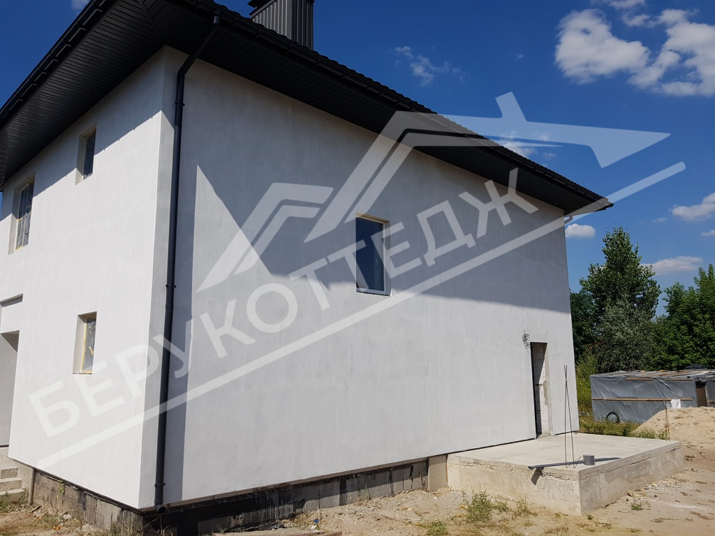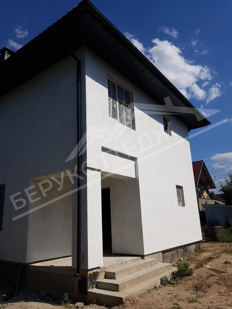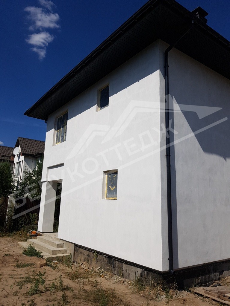 - Отделка: установлены окна, утепление наружных стен, нанесена декоративная штукатурка, подшиты свесы вагонкой.