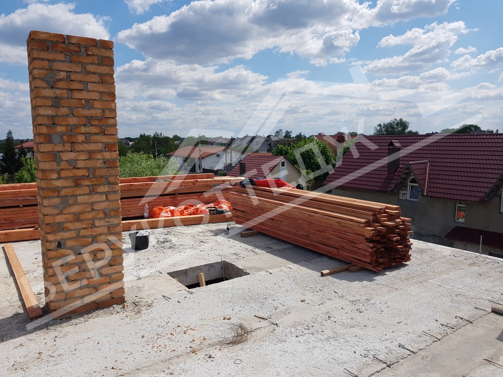 - Перекрытие: монолитное первого этажей и деревянное второго этажа, утепление по между деревянными балками второго этажа 250 мм. базальтовой ватой.