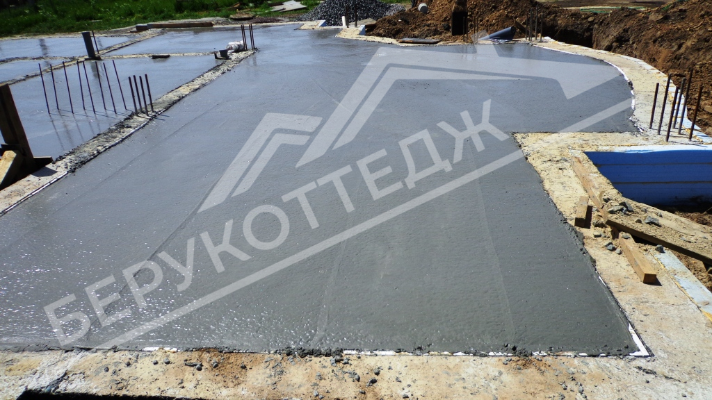 Фундамент: блочный с монолитным армирующим поясом, обмазочная гидроизоляция, плита пола и разводка коммуникаций под плитой.